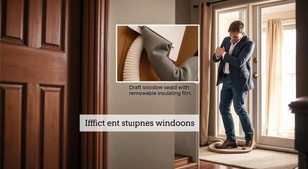 Start by using a door draft excluder or a rolled-up towel. These block cold air from under your doors. For windows, try a window draft stopper or a clear plastic kit to stop air leaks.